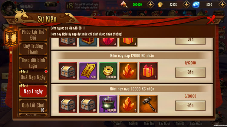 - Phần Thưởng: Dựa theo thời gian mở máy chủ (từ 15 - 30 ngày, 31 - 60 ngày, 61 ngày trở lên) sẽ có những phần thưởng khác nhau. Chi tiết vui lòng xem ở giao diện Sự Kiện